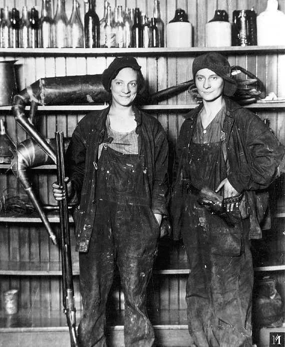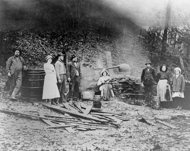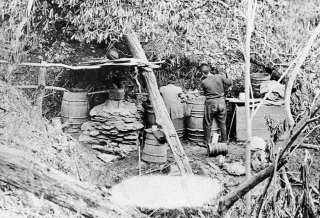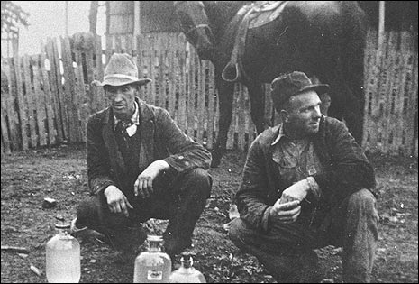 9. Jim Yates és Roosevelt Ficht pár üveg moonshine-nal, 10 mérföldre Kingstontól, Madison megyében, 1942-ben. A zugkotyvasztott szeszes italt azért hívják moonshine-nak, mert éjszaka főzték, hogy a füstöt ne vegye észre a hatóság. Egyéb elnevezések: white lightning, mountain dew, hooch, Tennessee white whiskey.