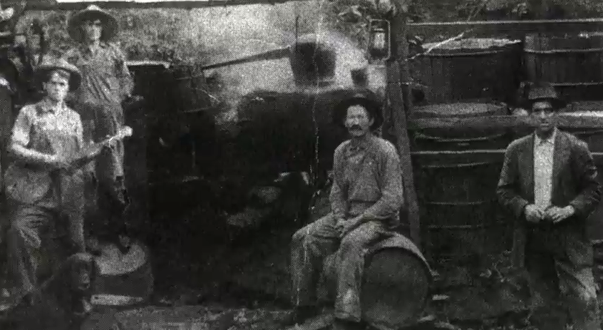 11. Titkos hegyi konyha a 10-es években. Banjoval: Arthur Martin, tőle jobbra: Sparrel C. Rakes, T. P. Press Martin, Wiley Thomas. (fotó: Blue Ridge Institute & Museum of Ferrum College, Franklin County Bicentennial Collection)