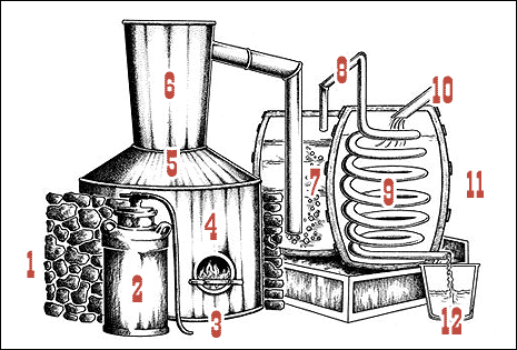 7. A recept: 6,5 font darált kukorica, 300 font cukor ,1 font élesztő, opcionális ízesítőanyagok, 300 gallon víz.
