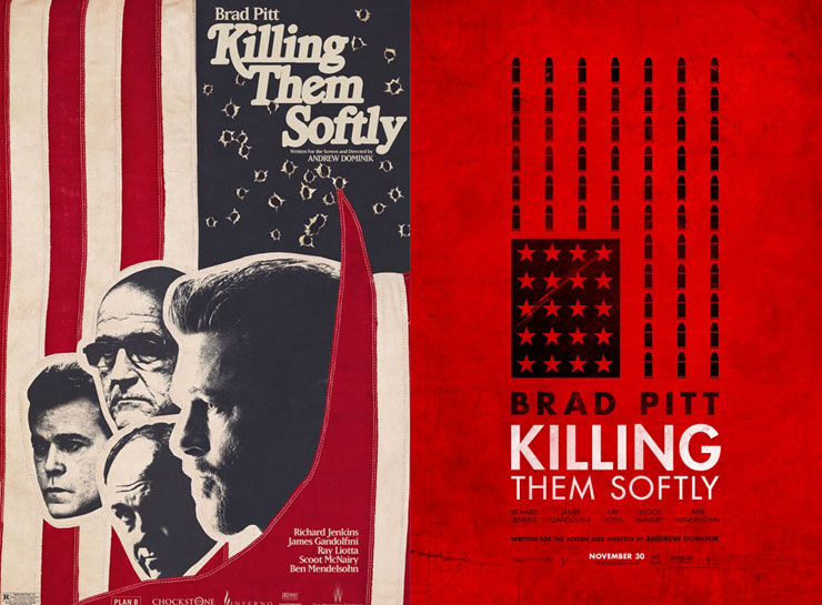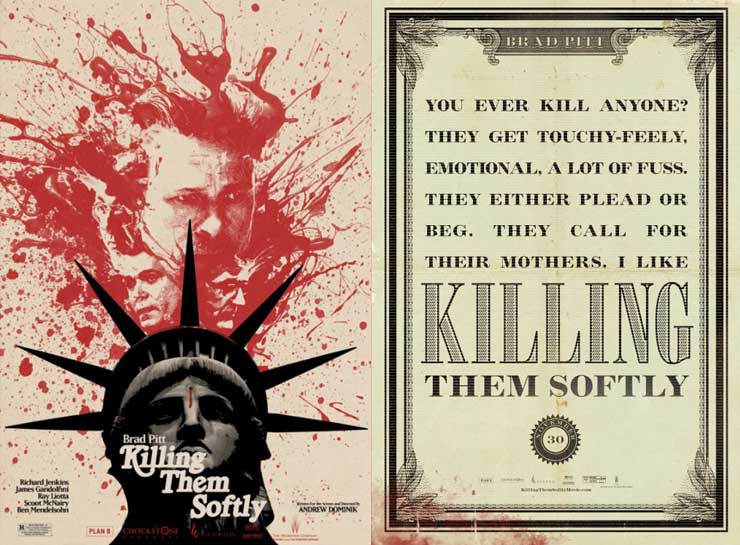 Az erőteljesen textúrázott, vintage-es teaser-széria amúgy nem túl közlékeny, de Brad Pitt elrejtése a plakátokról azt a forgalmazási attitűdöt idézi, melyet már Dominik és Pitt már első közös filmjük, a Jesse James meggyilkolása, a tettes a gyáva Robert Ford címválasztásánál is elkövettek. A korábbi film esetében a túlinformáltság, ez esetben pedig a hiány jelenti, hogy nem a mainstream halmazába való bekerülés az elsődleges cél. A minimalista plakátok emelett azonban direkten kijátsszák a bevett színkombinációkon (piros, fehér, kék, fekete) és emblémákon (töltény, zászló, nyilatkozat, Szabadság-szobor) alapuló vérnyomos hazafiasság-kritika kártyát. Szerzői műfaji film készül a javából.