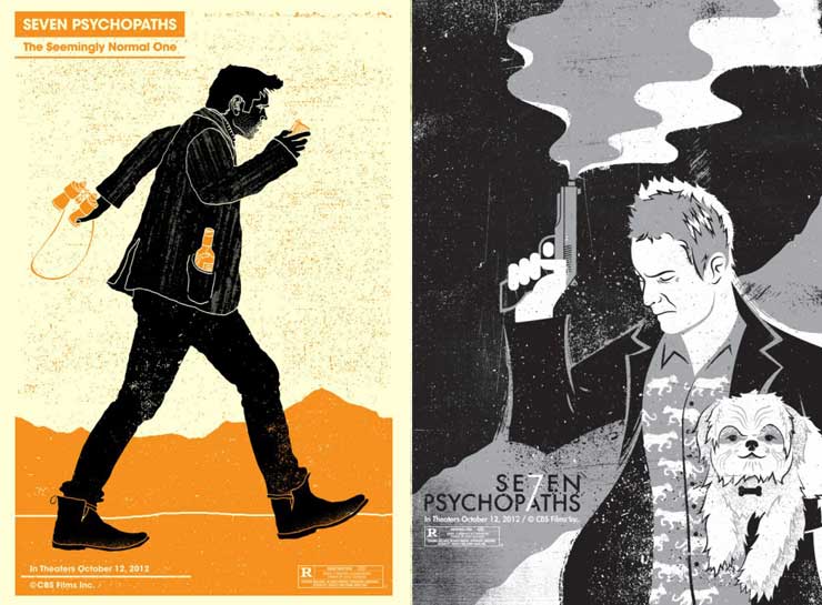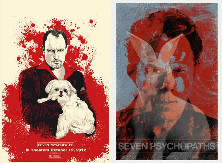 A méltán kultikus státuszú In Bruges – Erőszakik hullámain lovagol a Seven Psychopaths plakátkampánya. A Tom Waits, Woody Harrelson, Colin Farrell, Christopher Walken, Sam Rockwell és Olga Kurylenko portréját ábrázoló egyedi, kézirajzok flyerként is megállnák a helyüket. A sem szlogenben, sem más információban, pláne storyline-ban nem bővelkedő posztersorozat ebben az esetben pedig teljesen adekvát választás, mivel a cím maga is hét őrült tablójáról árulkodik. Az indie-magazinok borítójára emlékeztető karakter-teaser széria bizonyára megrendelhető sorszámozott nyomatokon.
