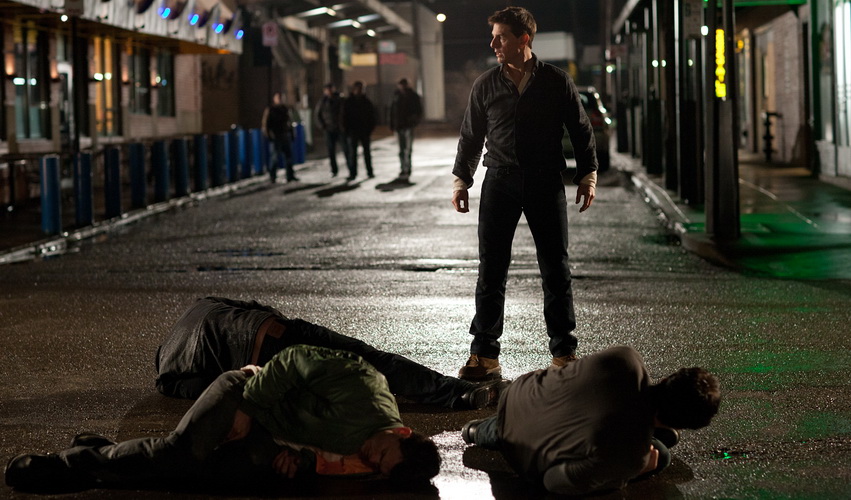 A remek, Piszkos Harry-i szótlan hidegvérrel kivitelezett nyitójelenet után (melyben igen kényelmetlenül egy tömeggyilkossal kell azonosulnunk, aki távcsöves puskája szubjektívjével a szemünk láttára „válogat” a lehetséges áldozatok között) kezdődik meg a magának való Jack Reacher mítoszának építése, és, egyelőre a pozitívumokra szorítkozván, ekkor még kellemes, nosztalgikus érzés lehet úrrá a befogadón. Az expozíció és az innen fenntartott atmoszféra egy elveszett Siegel, Lumet, Friedkin vagy Yates-produkcióra hajaz, ahogy Joe Kraemer parádés zenéje is karfaszorongató feszültséggel telve dübörög a szépen felvett pittsburghi városképek alatt. Karakteréből fakadóan Reacher akármely klasszikus western büszkeségévé is válhatna, a film tömve van erre utaló motívumokkal, elég csak felidézni a Bullitt vagy A francia kapcsolat legendás autós üldözései előtt tisztelgő aszfalthajszát megelőző párbaj-felállást, vagy az egyébiránt korrupt törvény felett álló igazságosztó karakterét, aki városról-városra utazgatva segít a rászorulókon. (A filmet záró Szupercsapat-narráció viszont már csak szimplán és kínosan megmosolyogtató.) Elsőszámú humorforrásként Reacher nem evilági időntúlisága is számtalanszor előkerül, vagy azért, mert nincs e-mail címe, vagy azért, mert busszal és stoppal szeret utazni, vagy azért, mert mindenféle eszköz nélkül, szikár kegyetlenséggel, de ki-kikacsintó gegekkel hatástalanítja az életére törő gonosztevőket. Az akciójelenetek ennek megfelelően rövidek, tömörek, az ütés az ütés, a csonttörés az csonttörés, míg az eldördülő lövések Michael Mann-i hangerővel ostromolják dobhártyáinkat. A Reacher-enigmát illetően viszont bántó túlkapásokat fedeztem fel, következzenek hát a film sajnálatos negatívumai.