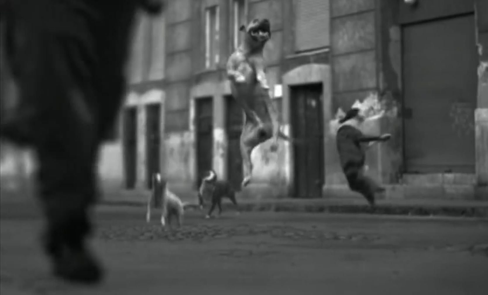 Az ugráló kutyák. (Ráadásul ha jól látom: harci kutyák.) Mintha a megkergült emberiségen mulatnának.