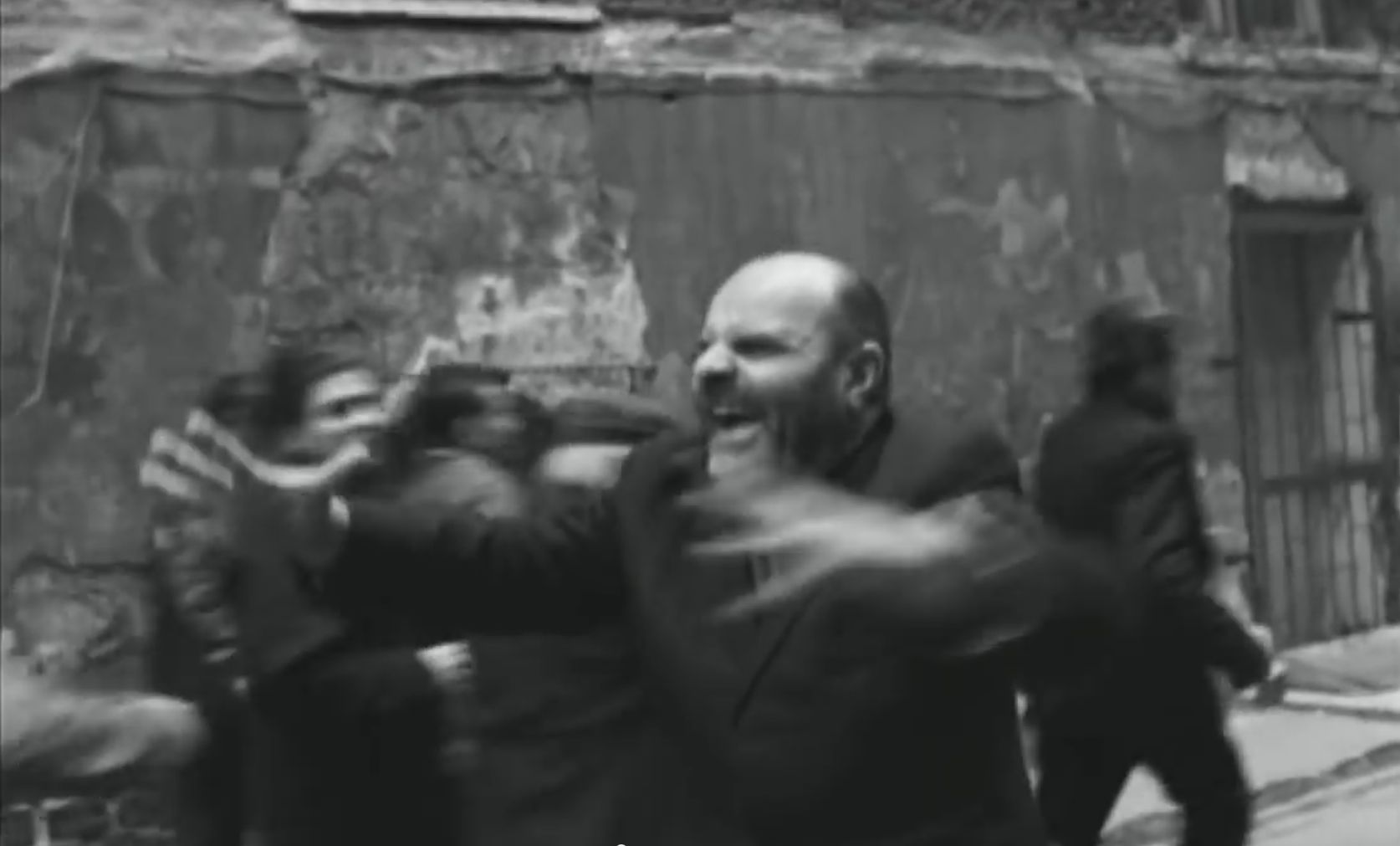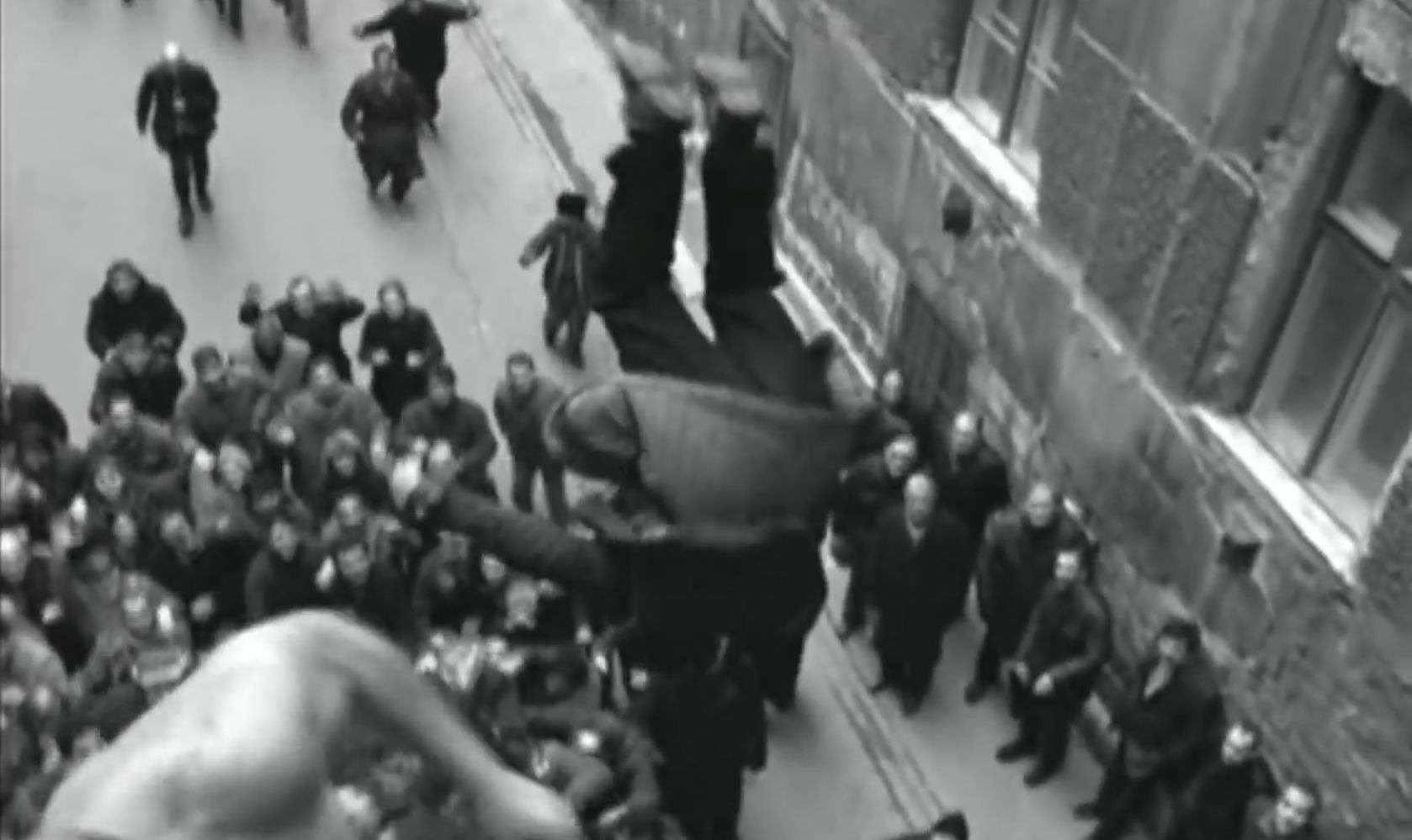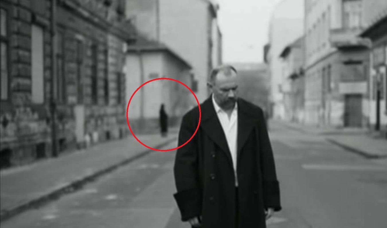 A háttérben, teljesen kiesve a mélységélességből egy alak a rohanó tömegnek integet (?) vagy tapsol (?). Ezt tényleg csak a huszadik újranézésre vettem észre, olyan jelentéktelen de mégis totálisan bizarr részlet, ami akár valami hiba is lehet. Egy forgatásra tévedt részeg járókelő? Egy ideges házmester?