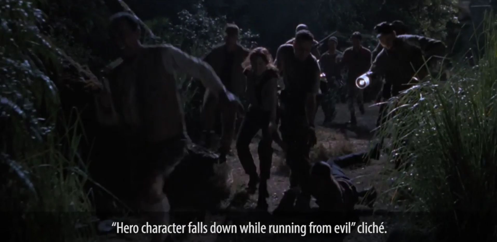 – semmilyen részlet nem marad észrevétlen: „a gonosz elől menekülő eleső hős”-klisé