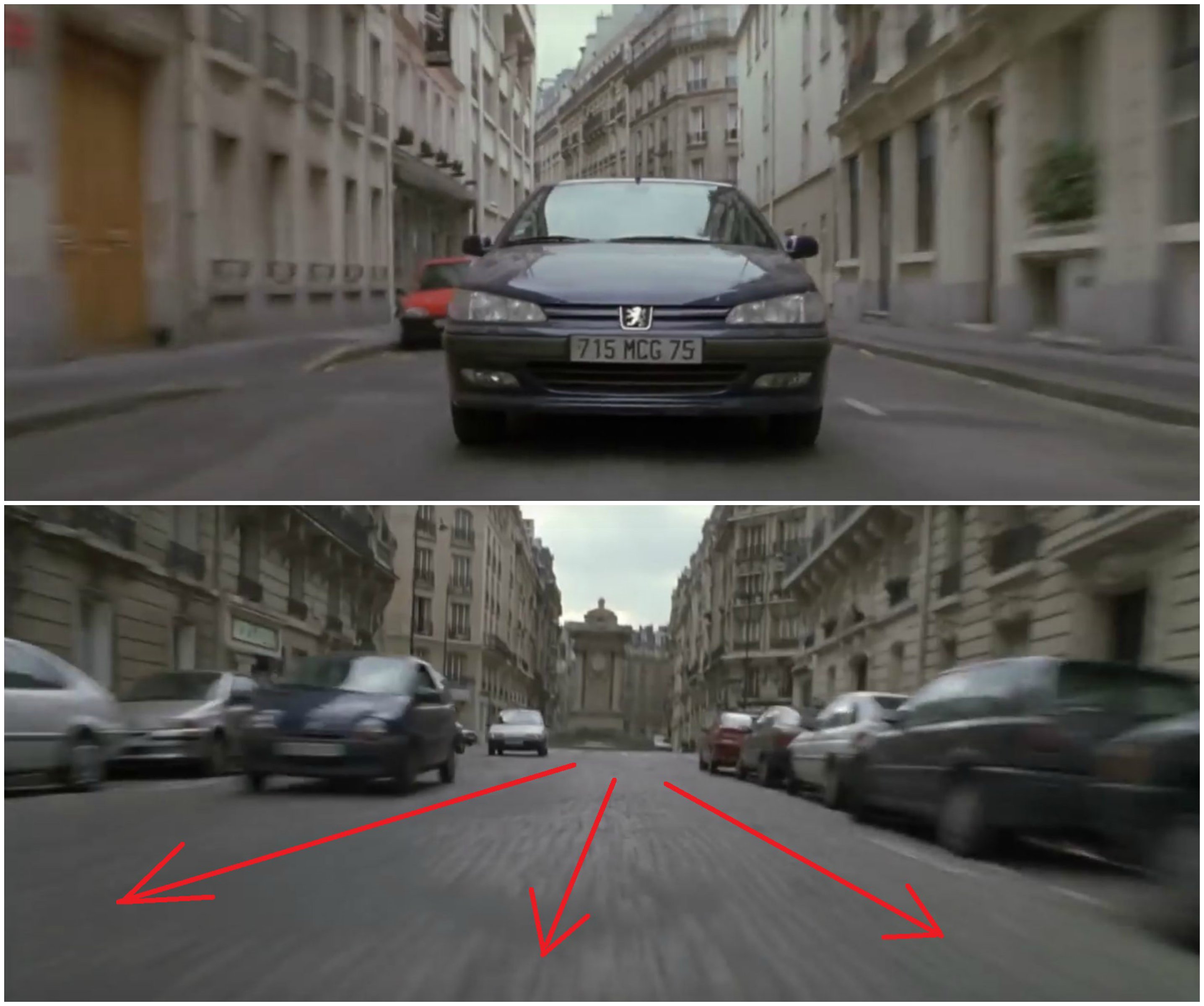 A kocsi orrára tett kamera, illetve a repesztő autót elölről mutató beállítás nagylátószögű optikával készült, hogy a környezet mozgása a torzítás révén élénkebb legyen. Egyébként a nyolcvanas években Luc Besson ezzel az egyszerű módszerrel vette fel a Metró üldözéses jeleneteit.
