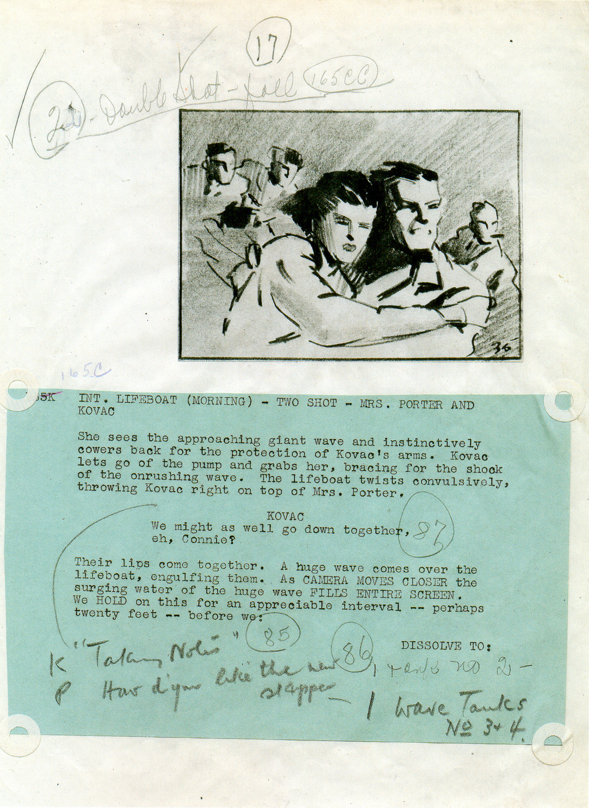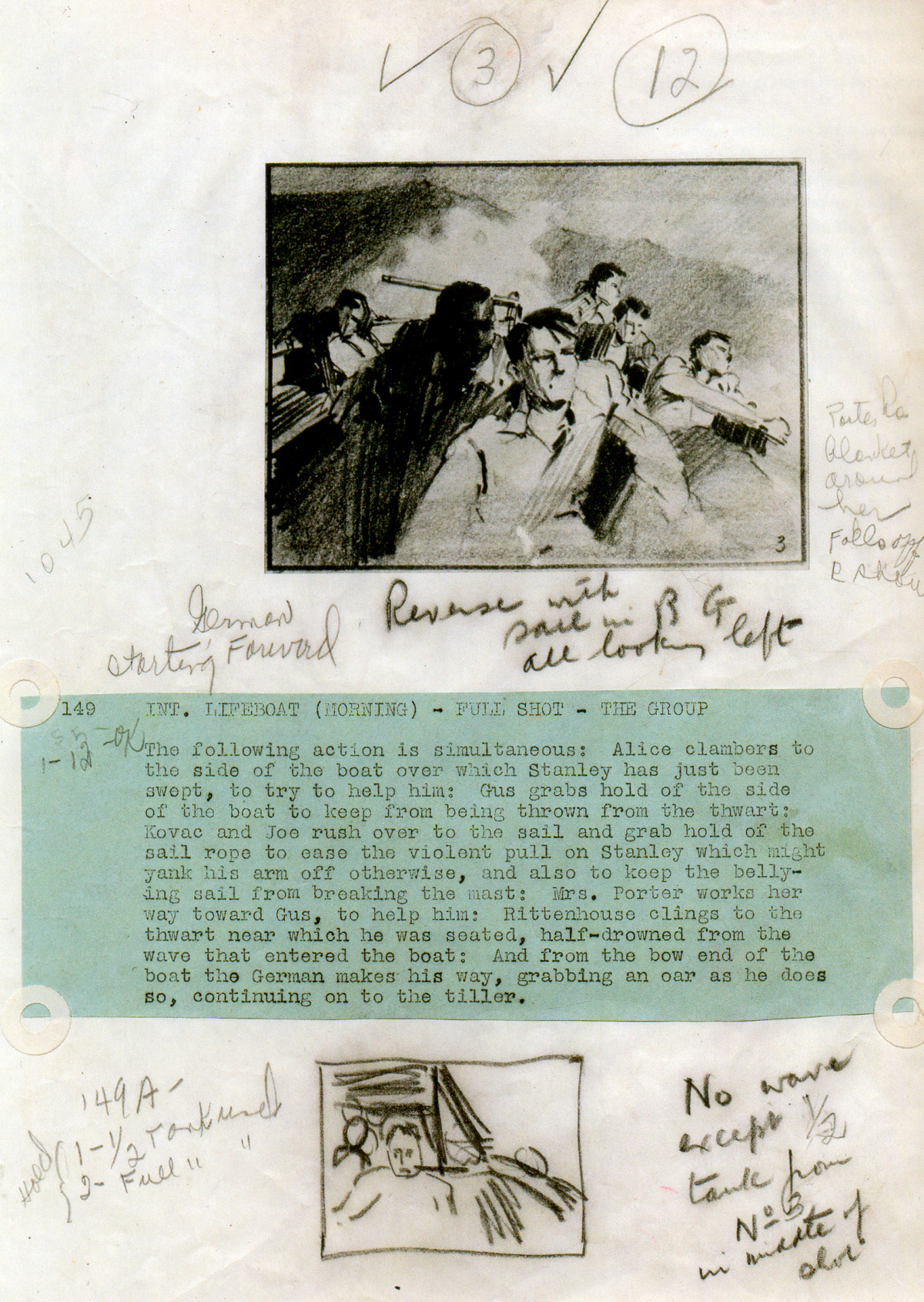 Itt van két rajz a Mentőcsónak-hoz, forgatókönyv részlettel és jegyzettel: