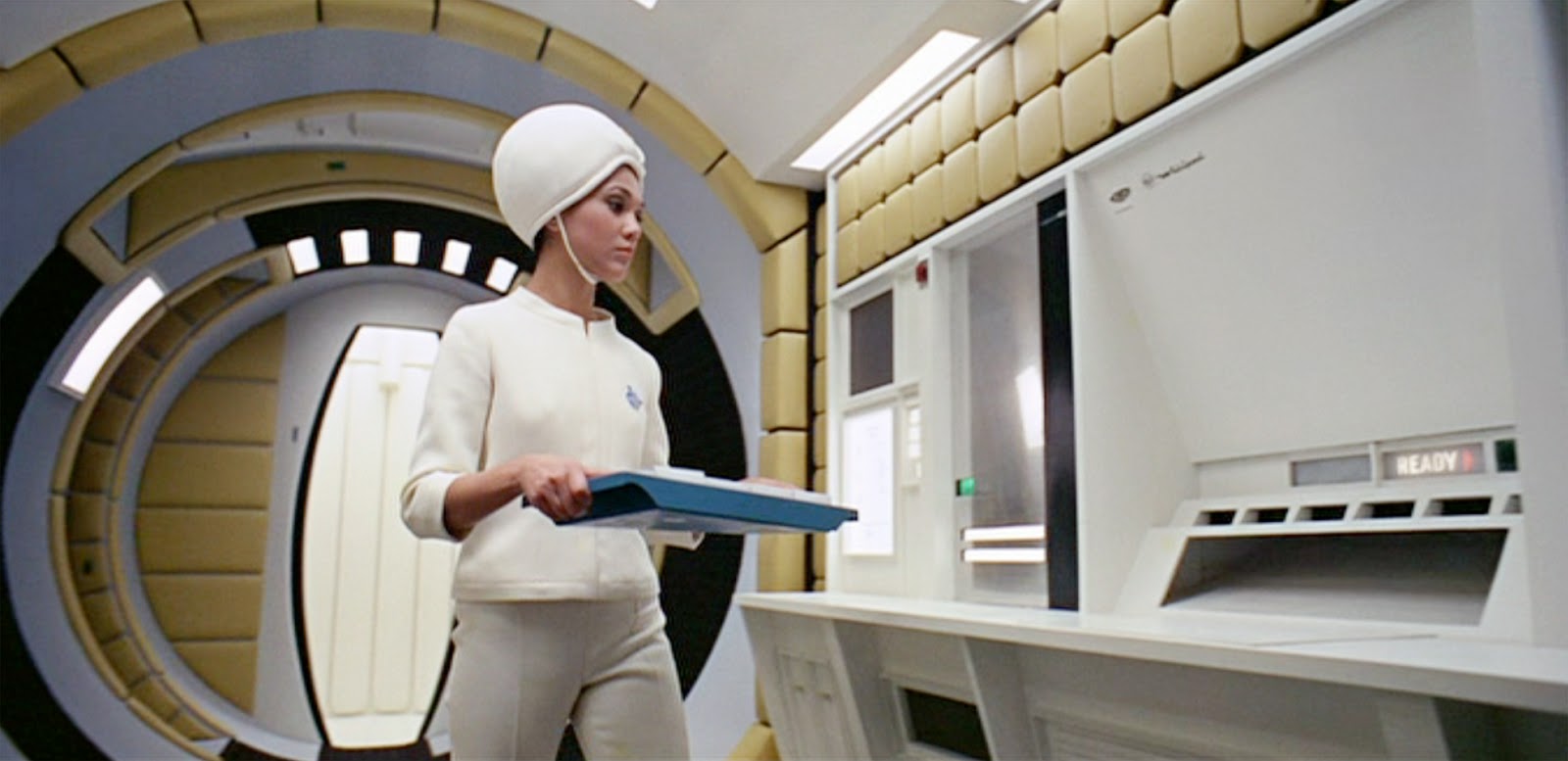 Eltelik négy millió év, és eddigre az emberiség mindent tönkretett az étellel kapcsolatban. Látjuk, hogy egy Pan-Am űrhajó közelít egy forgó űrállomáshoz. A „Pan-Am” név a repülőutakon felszolgált étel létezésére utal, ami általában silány minőségű. Heywood Floyd a fedélzeten videóhívást intéz a lányához. A kislány „fülesmakit” szeretne a születésnapjára – az eredeti elnevezés, a „bush baby” utalás azokra a bokrokra, amelyeket a majmok ettek. Mintha a lány öntudatlanul is figyelmeztetni szeretné az apját arra, mivel jár az étel megbecstelenítése. Floyd ezután találkozik az oroszokkal, és visszautasítja, hogy igyon velük egyet. Milyen faragatlan! Az ételnek elvileg közelebb kellene hoznia az embereket egymáshoz, de az ivással kapcsolatos hadakozás még mindig probléma. Floyd aztán elmegy, hogy együtt vacsorázzon az állomás biztonsági vezetőjével. A Holdra tartó űrkomp legénysége szívószállal fogyasztja az ételt, ami nem túl étvágygerjesztő; Floyd át is alussza az étkezést, hogy ne kelljen részt vennie benne. Az éhség azonban győzedelmeskedik rajta, aztán az űrvécén köt ki, ahol el kell olvasnia az instrukciókat, hogy tudja, hogyan kezelje gasztronómiai katasztrófáját. Később, a Hold felületén átkelve kinyitnak egy hűtőládát, és sonkás szendvicseket falatoznak. Sonkát! Tiltott ételt! (Hadd emlékeztessek mindenkit, Kubrick nem angol volt, hanem bronxi zsidó.) A sonkás szendvicses epizód után a Monolit fülsiketítő rádiójelet küld a Jupiterre, és további főzőleckék felé tereli az embereket.