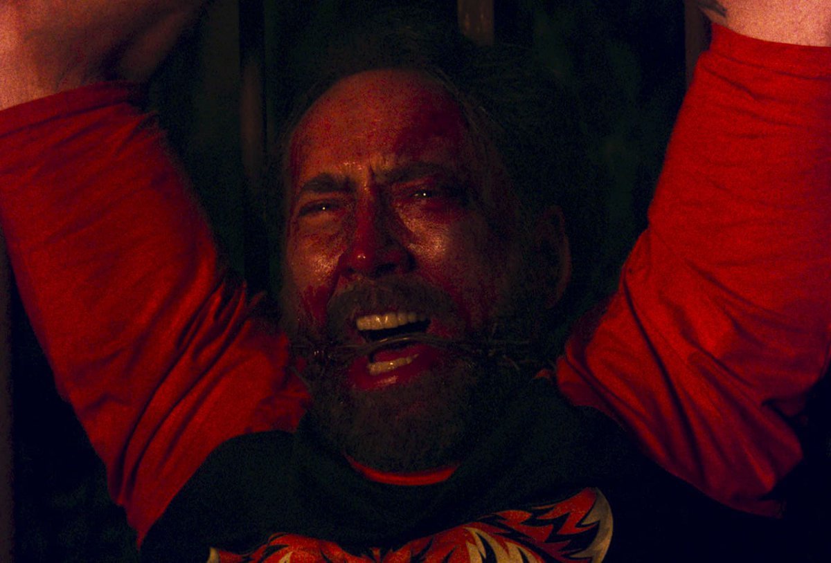 Amíg nem történik más, csak Cage és szerelme tévét néznek és simogatják egymást, addig kedvtelve néztem a lebegős, túlszaturált képeket, és hallgattam Jóhann Jóhansson himnikus szintizenéjét. De a túlszaturált képek és a himnikus szintizene azon filmes eszközök között vannak, amelyek rendkívül hamar öncélúvá és idegesítő válnak, Panos Cosmatos rendezőnek viszont esze ágában sincs stílust váltani. Amikor a szerelmesek a kedvenc bolygóikról beszélgetnek, már sejtettem, hogy valamiféle súlyos new age-nyomasztásba kerültem, és csak ekkor kanyarodtak be az erdőszéli városkába az elmebeteg sátánisták. A sztorit nincs értelme részletezni, a film legközelebbi rokona talán az I Drink Your Blood című 1970-es exploitation, aki azt látta – felteszem, olvasóink között nincsenek sokan –, annak mondom, hogy ez nagyjából ugyanaz, csak Nicolas Cage-dzsel.