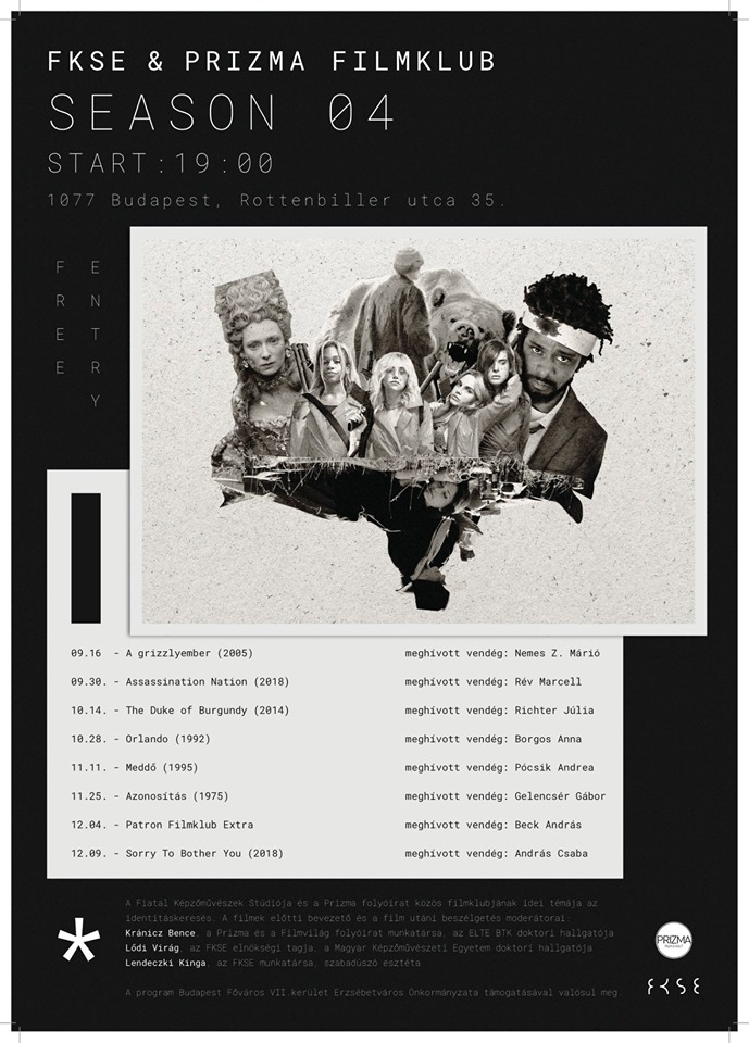 A féléves program ezen a plakáton, Simon Zsuzsanna munkáján olvasható. A meghívott vendégekkel Lendeczki Kinga és Lődi Virág (FKSE), illetve Kránicz Bence (Prizma) beszélgetnek.